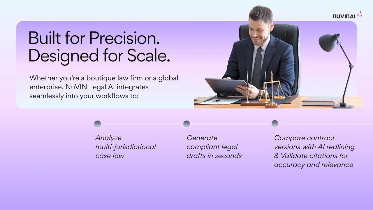 Streamline research, drafting, and contract review with intelligent automation. Built for small practices and large enterprises alike — NuVIN Legal AI adapts to your workflows, saves time, and ensures compliance.